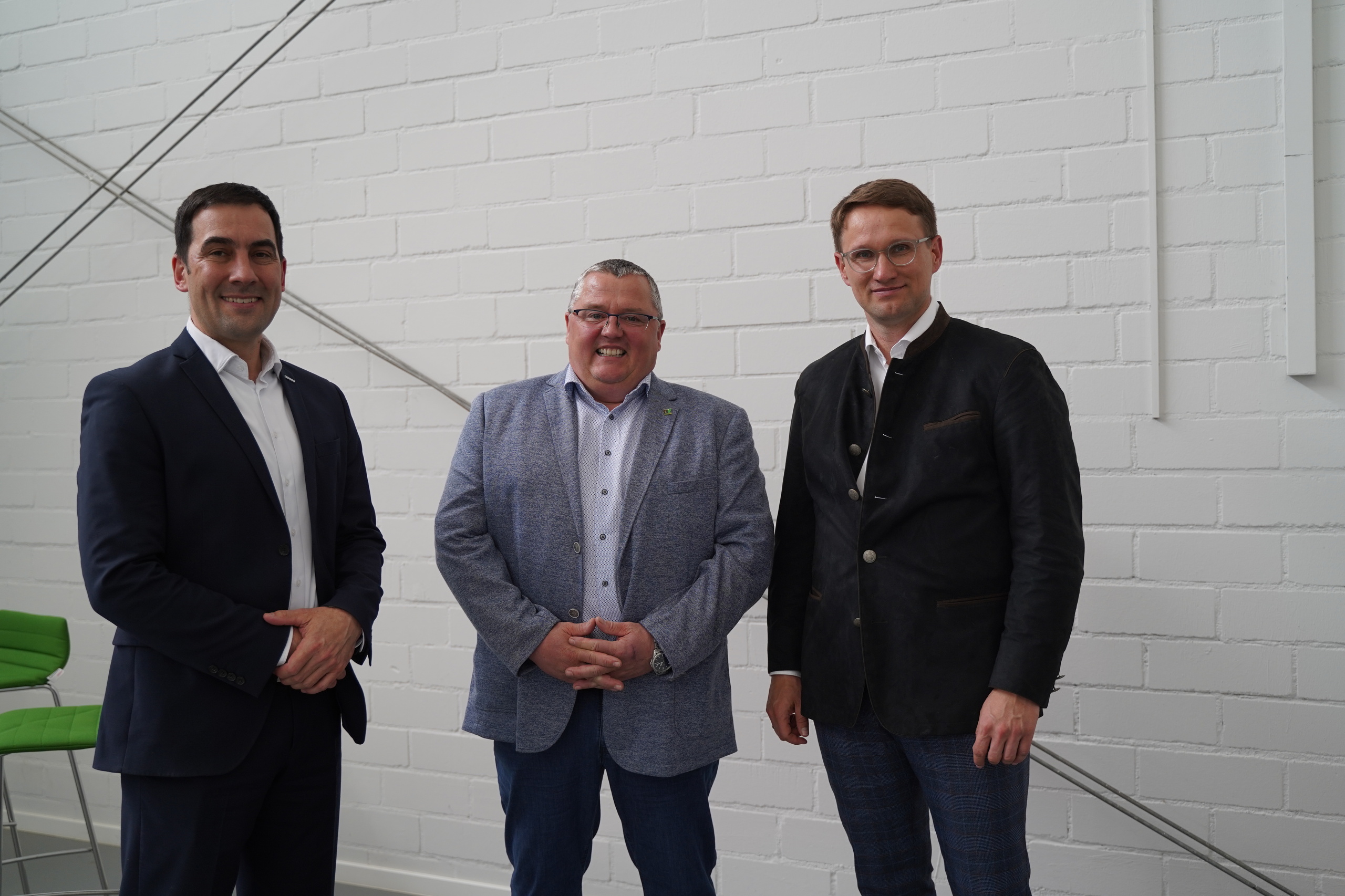 Dr Josef Mayer (left) and Patrick Langner-Möwes (HR Manager Fendt Hohenmölsen | right) are delighted to welcome Sven Borchert (Vice President of the Saxony-Anhalt Farmers' Association).
