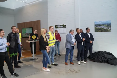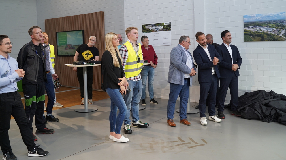 Dr Josef Mayer and the apprentices lift the black fabric to reveal the self-built system underneath. Built by the apprentices at the Hohenmölsen site, it is truly a one-off. Members of the press, local politicians and representatives of the farmers' association were invited to celebrate the unveiling of the dispensing station and this special project.