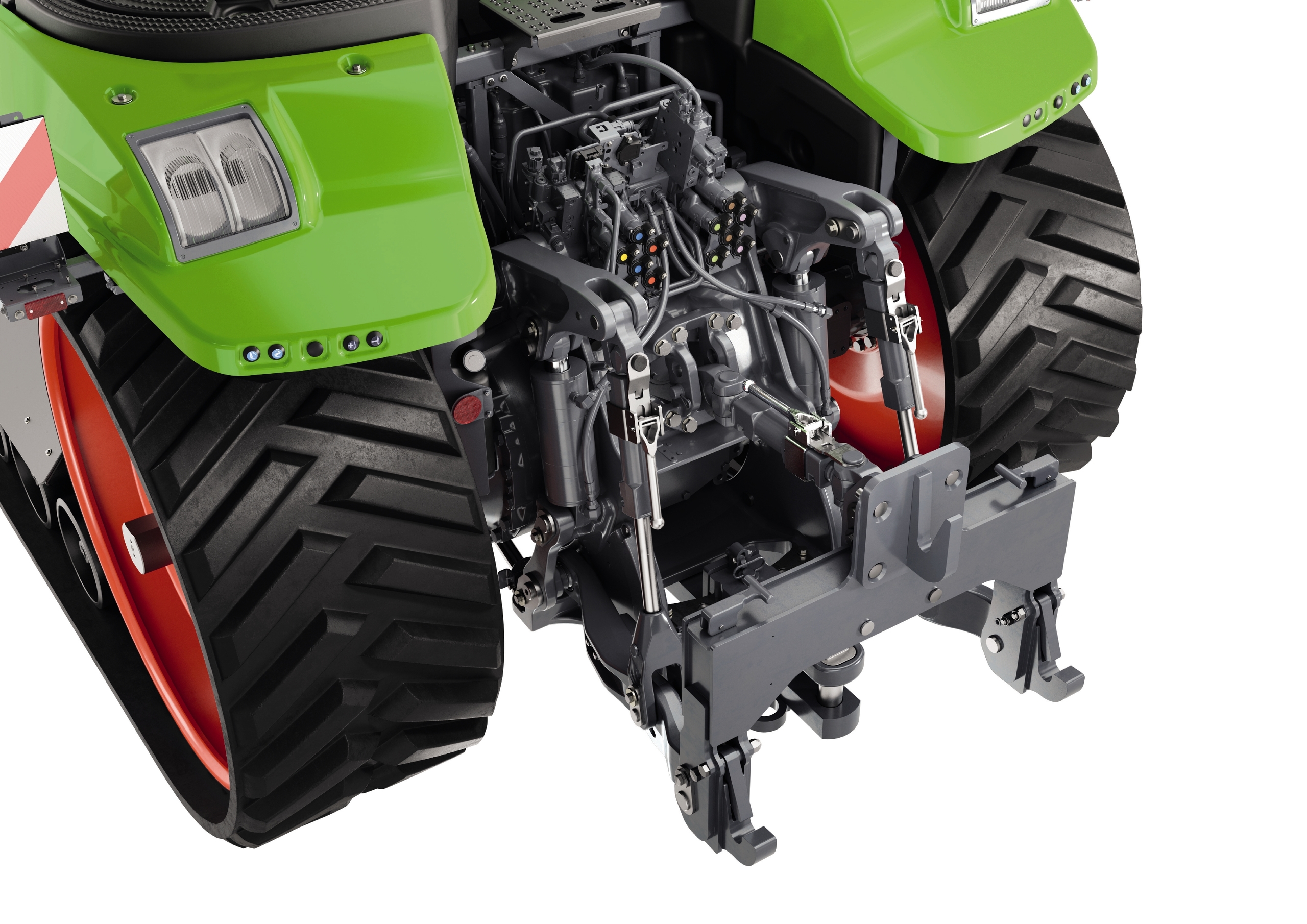 A special highlight of this machine is the exclusive pivoting swinging drawbar and pivoting rear power lift. The pivoting swinging drawbar can be swivelled 28° in either direction, while the pivoting rear power lift with three-point suspension has a movement radius of 12° in both directions. This means the pivot point of the attachment moves to the tractor's natural pivot point and the attachment runs with much more directional stability in combination with a tracking system. If there is an obstacle on the field dragging the attachment on the side, the attachment can swerve around it without the tracked tractor leaving the track.