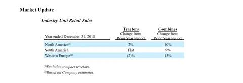 “Another year of strong global crop production kept commodity prices at relatively low levels and pressured farm income,” continued Mr. Richenhagen. “Global industry sales of farm equipment in 2018 were mixed across AGCO’s key markets, with future demand dependent on factors such as commodity price development as well as government trade and farm support policy. The USDA is projecting 2019 farm income to be down modestly in the United States compared to 2018. While low horsepower equipment sales may begin to be under pressure from their historically high levels, high horsepower equipment sales are expected to continue their gradual recovery. Industry equipment demand decreased modestly across Western Europe in 2018. Farm income was negatively impacted by reduced crop production across parts of Western Europe and lower milk prices in the first half of the year. Lower demand across most of the European markets was partially offset by growth in the United Kingdom. Farm economics are expected to improve modestly across Western Europe in 2019, driven primarily by favorable wheat prices and more normal crop production. Based on these assumptions, we expect sentiment to remain positive and 2019 demand to be stable across the European markets. Industry equipment demand in Brazil improved in the second half of 2018 after more positive terms for the government financing program were announced. Market growth in Brazil was offset by weaker demand in Argentina in response to a weak first harvest and poor general economic conditions. Industry demand in 2019 in South America is expected to be improved compared to 2018. Higher retail sales in Brazil are expected to be partially offset by lower sales in Argentina. Our long-term global view remains positive. Increasing demand for commodities, driven by the growing world population, rising emerging market protein consumption and biofuel use, are all expected to support elevated farm income and healthy conditions in our industry.”