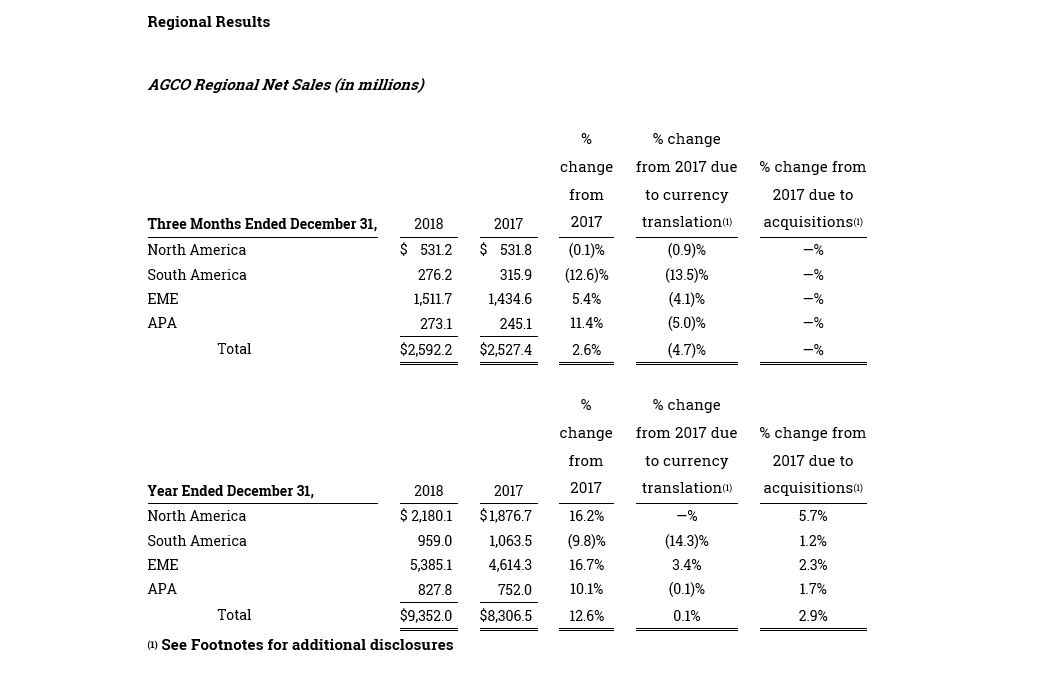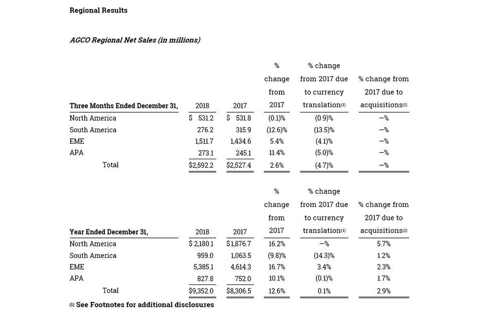 “AGCO delivered solid results in 2018 while making important investments to position us for future success,” stated Martin Richenhagen, AGCO’s Chairman, President and Chief Executive Officer. “Sales growth across all of our regions and solid operational execution allowed AGCO to meet its financial targets for 2018 and deliver improved results compared to 2017. We are growing our business by delivering the broadest product offering in the industry. We provide full-line smart farming solutions to our customers throughout the agricultural production cycle, starting with soil preparation and cutting-edge smart planting, through spraying and harvesting, and ending with grain storage and protein production equipment. AGCO will continue to invest in new products, new technology, improved distribution and enhanced digital capabilities in order to improve our margins and produce higher returns on our invested capital. Looking forward to 2019, we are forecasting further earnings improvement as industry conditions trend positively and we benefit from our cost reduction strategies targeted at purchasing actions and factory productivity, as well as new product development.”